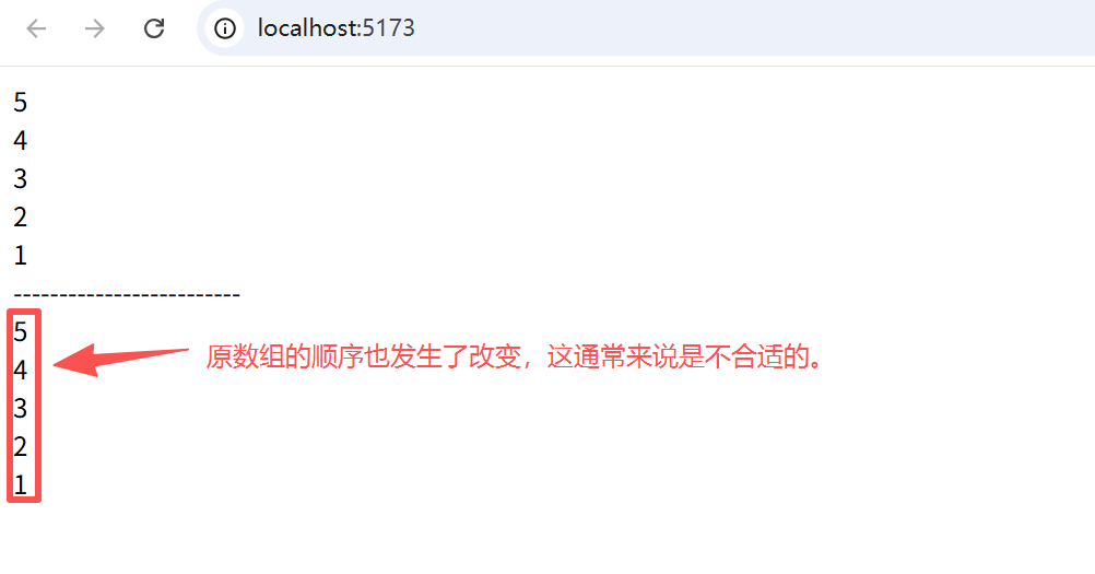 在计算属性中使用 reverse() 和 sort() 的时候务必小心!这两个方法将变更原始数组,计算函数中不应该这么做。