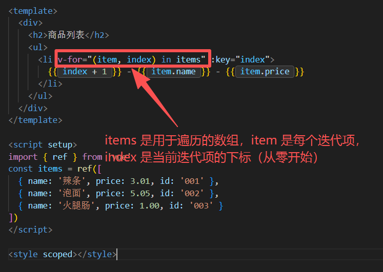 - [1. v-for 与数组(v-for 通常用于遍历数组,渲染列表)](#1. v-for 与数组(v-for 通常用于遍历数组,渲染列表))