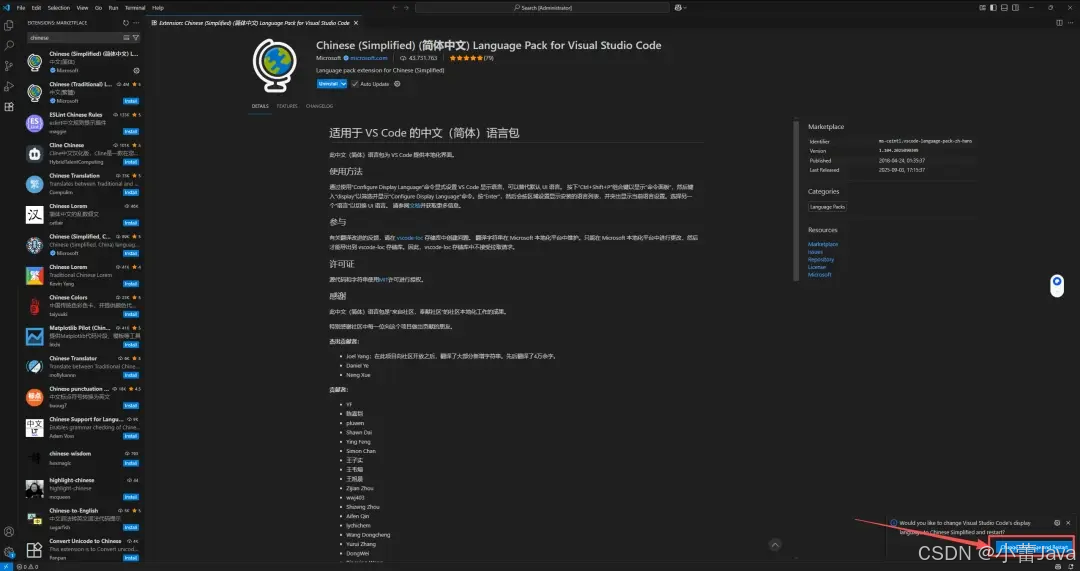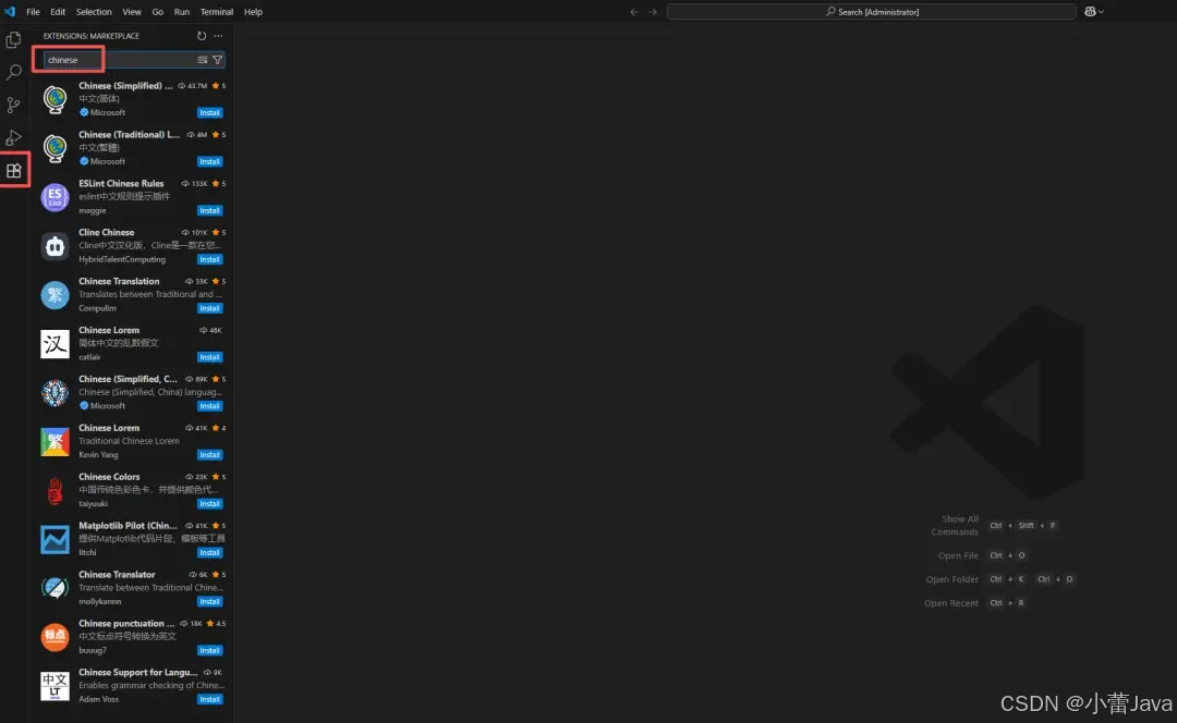 打开软件,点击最左侧工具栏,最下面扩展按钮,在搜索框输入:chinese,安装中文语言包