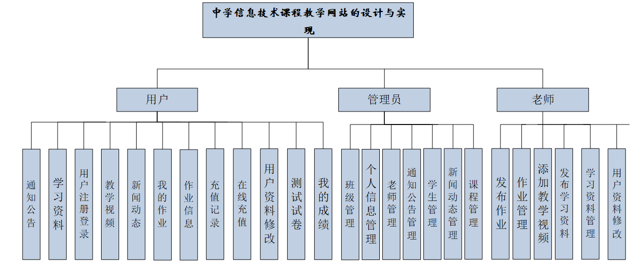 在设计中考虑到不同用户需求,系统涵盖了三个关键用户角色:教师、管理员和学生。教师能够通过系统实现课程管理、作业管理,成绩管理等功能对学生的成绩进行综合的提升,管理员则负责系统整体运行和管理对系统的各项功能进行总和全面的管理,学生则能够通过网站获取与学科相关的信息和学习资源,并实现考试,充值等等功能[1]。
