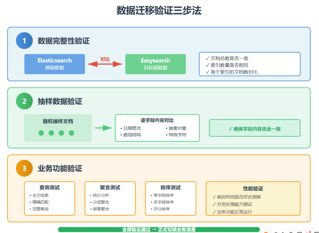 最后要在目标端执行常用的查询、聚合、排序等操作,验证业务功能是否正常,响应时间是否符合预期,只有通过全面验证后才能正式切换业务流量。