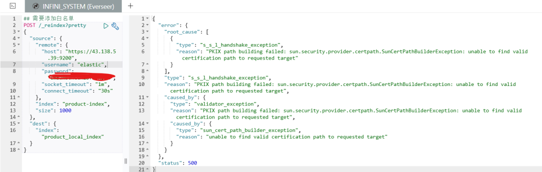 根本原因: 云端 Elasticsearch 和本地 Easysearch 之间存在 SSL/TLS 证书验证问题,跨网络的 reindex 操作无法建立安全连接。