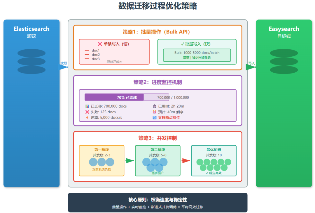 迁移过程中需要权衡速度与稳定性。建议使用批量操作(bulk API)而非单条写入,通常每批 1000-5000 条文档能够获得较好的性能。