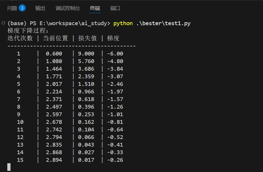 print("迭代次数 | 当前位置 | 损失值 | 梯度")