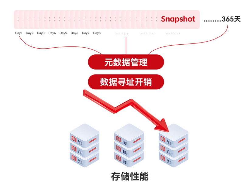 某医疗机构需按监管要求保留每日业务结束时的数据库快照,且需支持随时快速查询历史数据。在使用传统快照方案时,随着快照链不断增长,元数据管理和数据寻址开销导致存储性能显著下降------查询响应变慢,生产业务受到拖累。IT部门不得不在合规性与系统性能之间反复权衡,甚至考虑牺牲部分历史数据以维持业务运行效率。