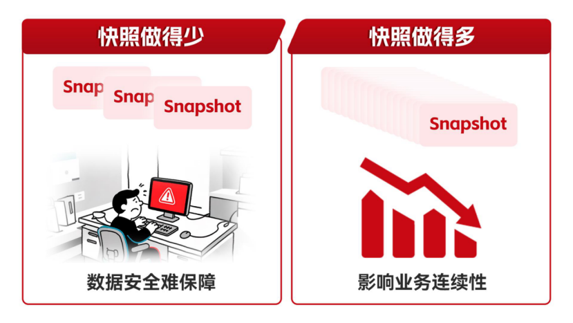 IT团队常陷入两难:不做快照,数据安全无法保障;做快照,又可能影响业务连续性。以往只能在业务低峰期匆忙执行快照,不仅操作窗口狭窄,更无法应对盘中突发性备份需求。