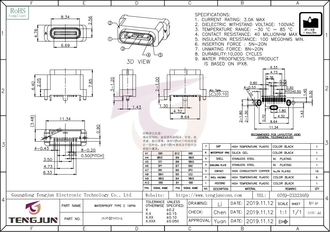 在消费电子、工业控制、户外设备等领域,连接器作为信号与电力传输的"桥梁",其性能直接决定设备稳定性与使用寿命。TENGJUN推出的JN16-BPS002-A-立贴型防水Type-C 16PIN连接器,凭借IPX8级防水、宽温适应、高集成引脚设计,成为高可靠性场景的优选方案。本文将从技术参数拆解、结构设计亮点、性能测试验证、适配场景拓展四大维度,全面解读该产品的核心竞争力与应用价值。