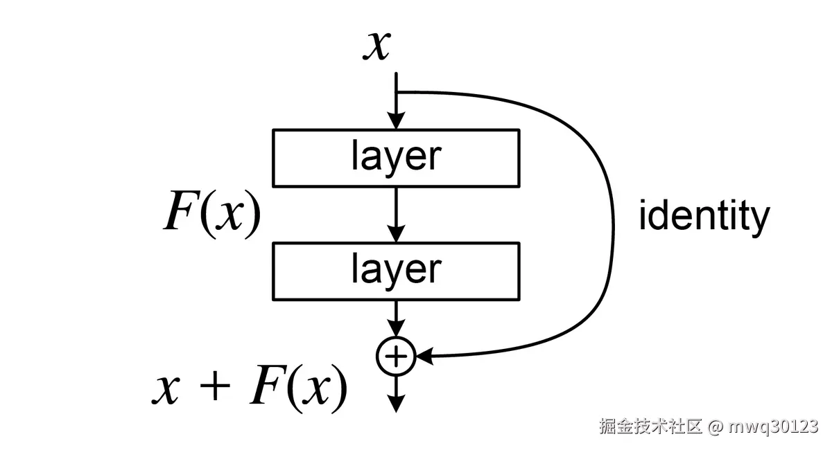 图示:一个残差块。输入 x 直接连接到层变换 F(x) 的输出,共同构成了最终的输出 H(x)。