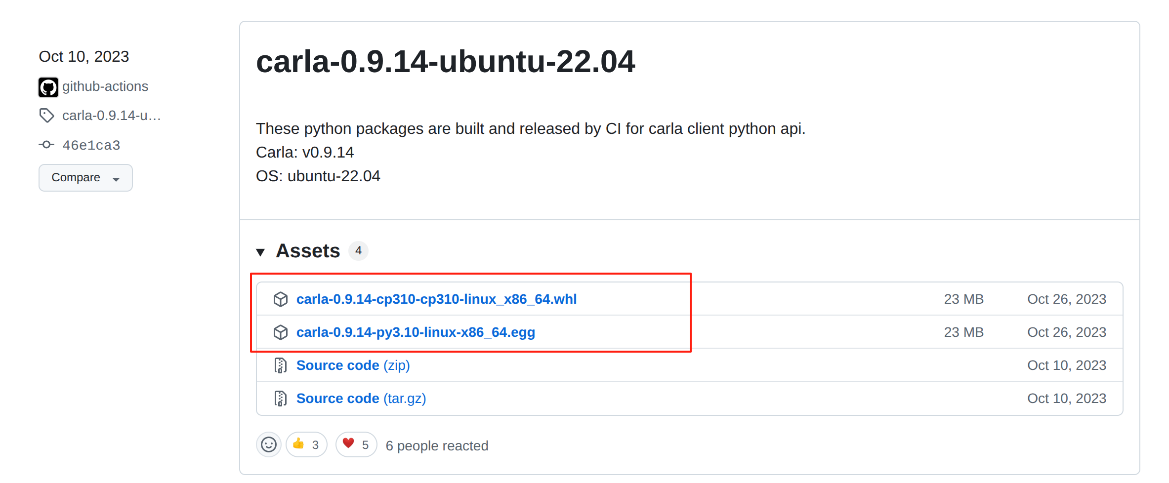 从https://github.com/gezp/carla_ros/releases/下载红框中两个文件,一个whl,一个egg。whl文件用于安装在虚拟环境,egg用于配置路径。下载后,移动到${CARLA_ROOT}/PythonAPI/carla/dist/路径下。