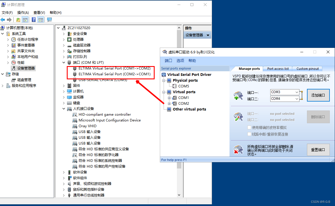 为了测试多个串口,使用了虚拟串口软件,虚拟出了COM1,COM2