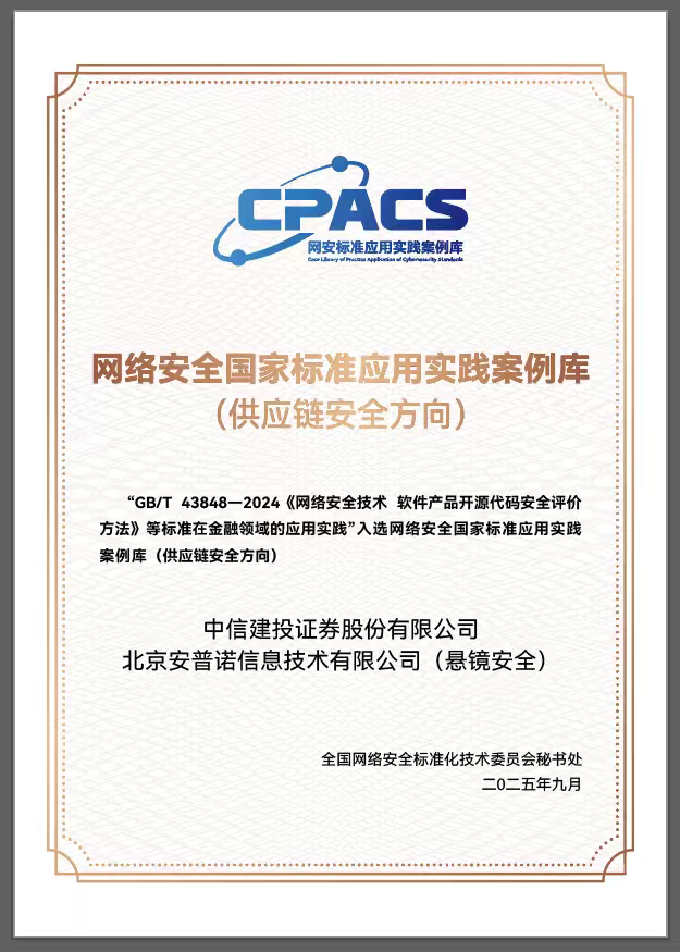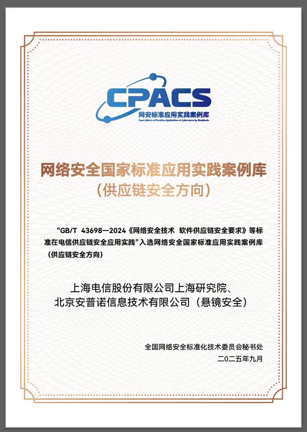 近日,2025年国家网络安全宣传周在昆明举行。会上,全国网络安全标准化技术委员会正式公布了"网络安全国家标准应用实践案例库(供应链安全方向)"的案例入选名单。悬镜安全凭借其在数字供应链安全领域的十余年技术沉淀,以及作为行业领航者前瞻性进行多项国家标准、行业标准的深度研究与实践,携手中国电信上海研究院、中信建投证券等重点行业代表企业同时入选,分别成为GB/T 43698《网络安全技术 软件供应链安全要求》 在电信领域与GB/T 43848-2024《网络安全技术 软件产品开源代码安全评价方法》 在金融领域的标杆实践。这不仅是对合作伙伴卓越安全建设的肯定,更是对悬镜安全作为行业开拓者在推动国家标准落地、赋能千行百业数字化安全基石的权威认证。