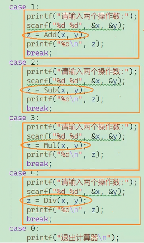 当我学了函数指针数组之后,再仔细审视该代码,我们会发现被调用的 add()、sub()、mul()、div()这些函数的返回类型和参数类型都一样,因此,我们考虑是否可以将这些函数像存变量一样存入到一个数组中,用到哪个直接调用即可: