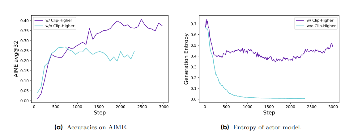 - 避免了熵塌的现象 (因为高的\(\epsilon_{higher}\)鼓励模型探索原先小概率的正向轨迹,提高了多样性)