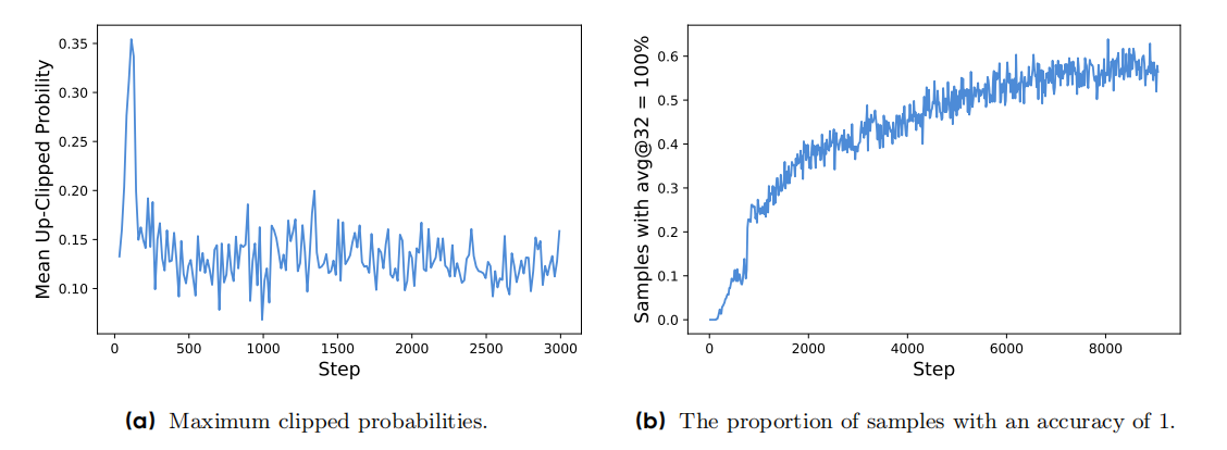 大量小概率的token被clip掉了,这验证了\(\epsilon_{high}\)阻碍了低概率token 概率的增长。