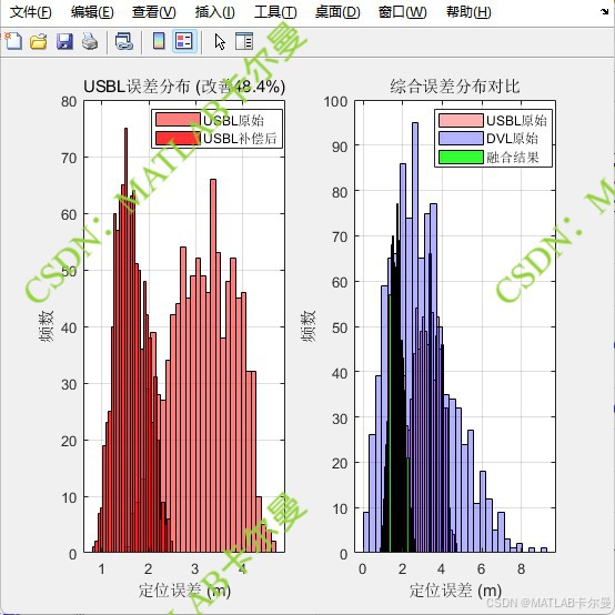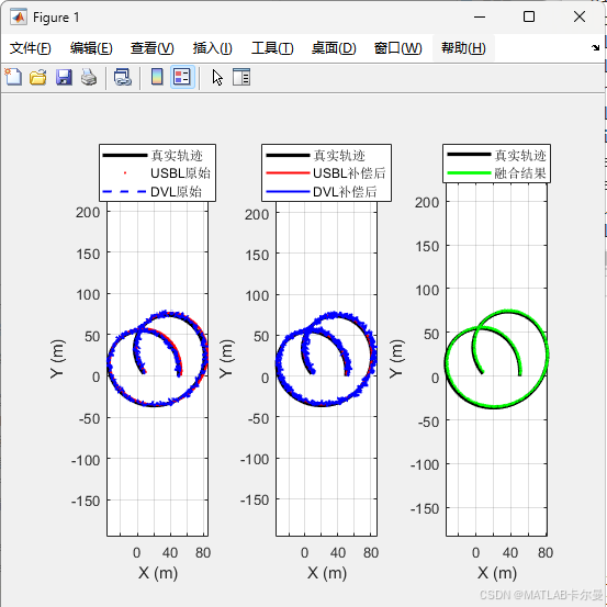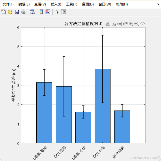 本文所展示的程序通过线性回归(Linear Regression)和基于方差的最优加权融合 的方法,对水下常用的两种导航传感器------**超短基线定位系统(USBL)和多普勒计程仪(DVL)**的测量数据进行相互补偿和优化,以提高水下定位的精度。
