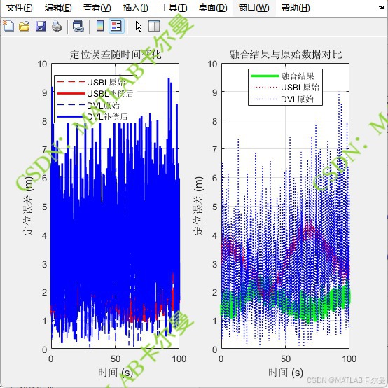 程序旨在通过线性回归(Linear Regression)和加权融合 的方法,对水下常用的两种导航传感器------**超短基线定位系统(USBL)和多普勒计程仪(DVL)**的测量数据进行相互补偿和优化,以显著提高水下定位的精度。