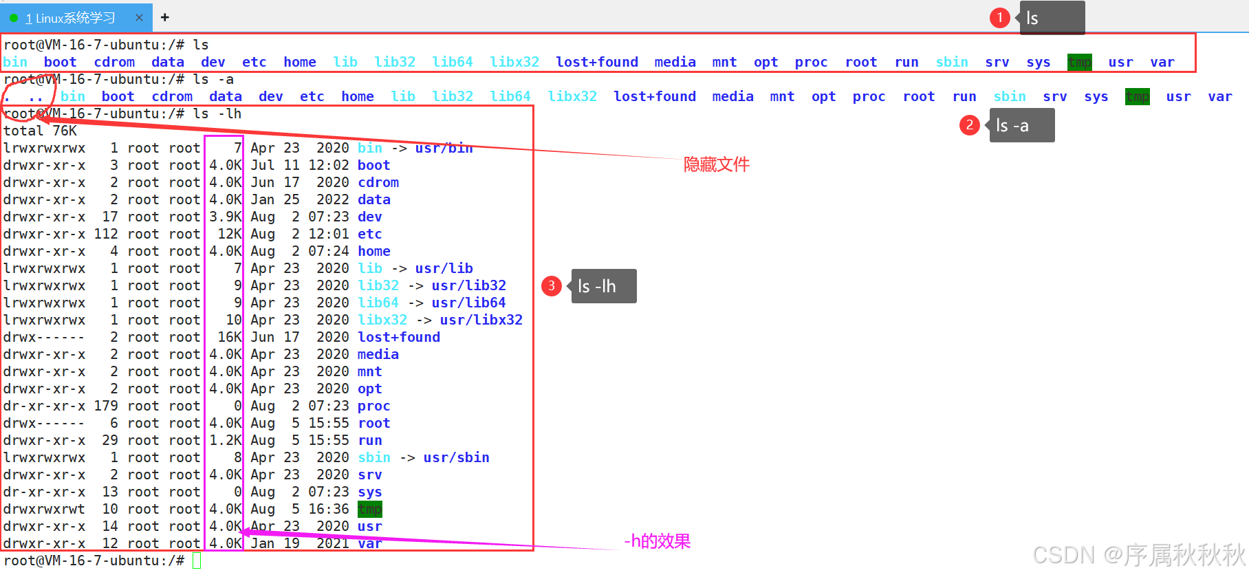 ,显示所有文件,包括隐藏文件)- 组合使用 :多个短选项可以合并,例如:ls -la 等同于 ls -l -a