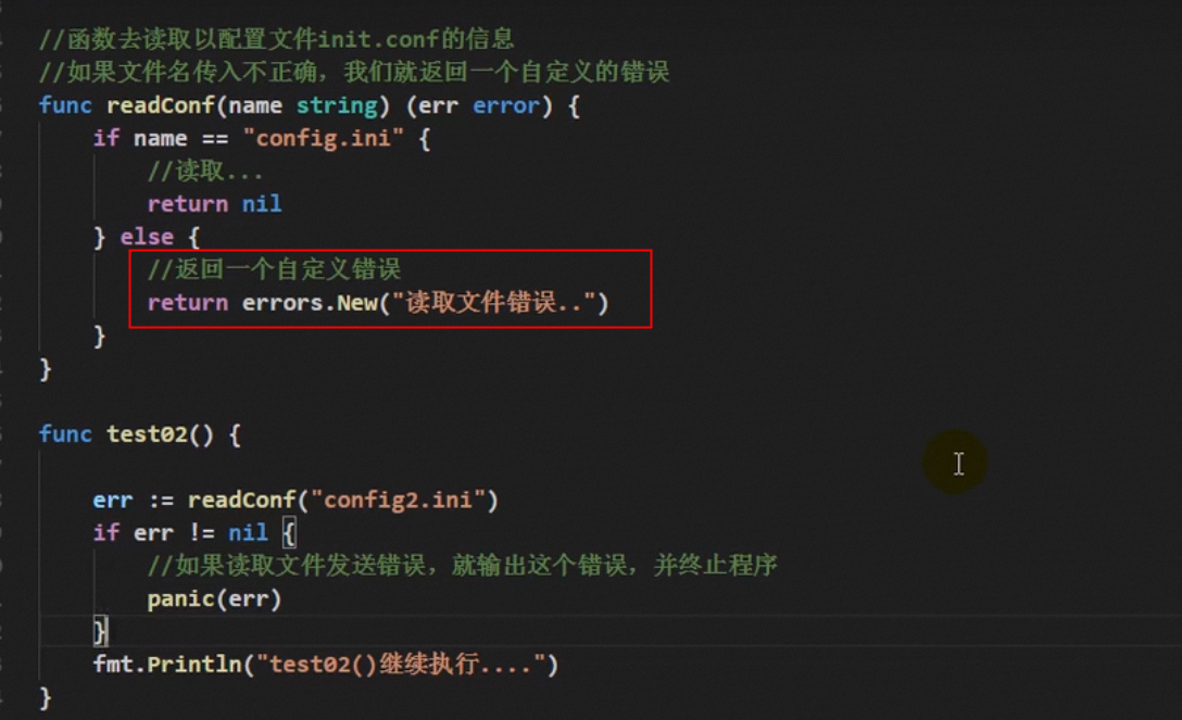errors.New("错误说明"),会返回一个error类型的值,表示一个错误