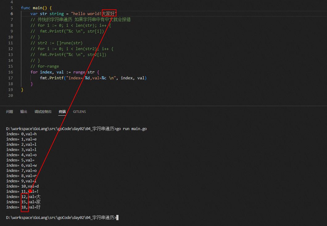 注意:for-range遍历字符串时,是按照字符来遍历的,而不是按照字节来的。