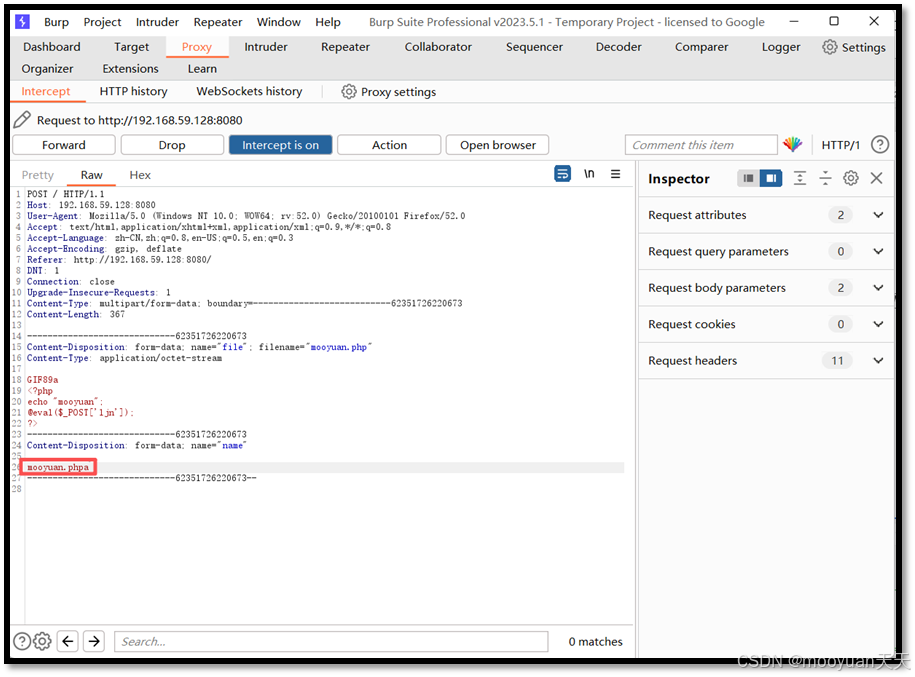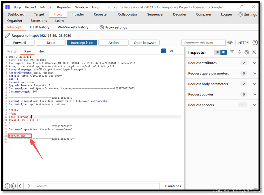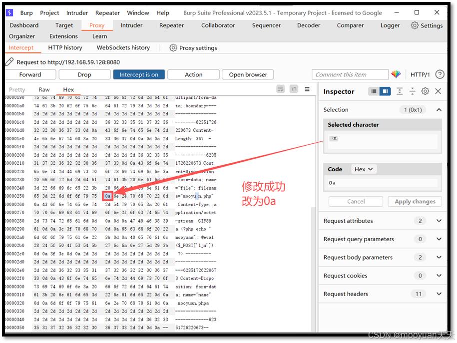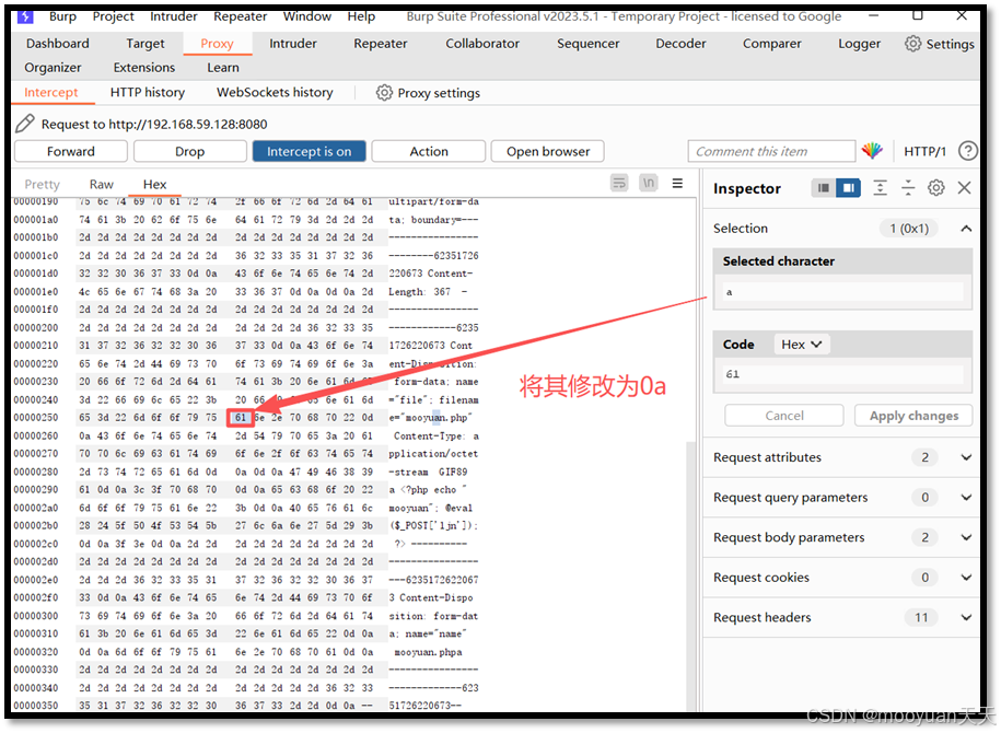 点击上传后bp抓包,如下所示,将上图红框内部的【mooyuan.php】修改为【mooyuan.phpa】,即文件名后缀增加一个a,这样做是a的16进制为61,为方便找到将其改为0a。