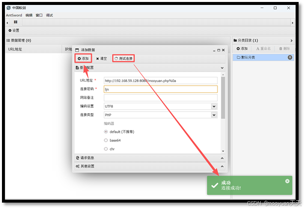 使用蚁剑连接木马,配置如下所示,点击测试连接提示连接成功,点击左上角的添加。