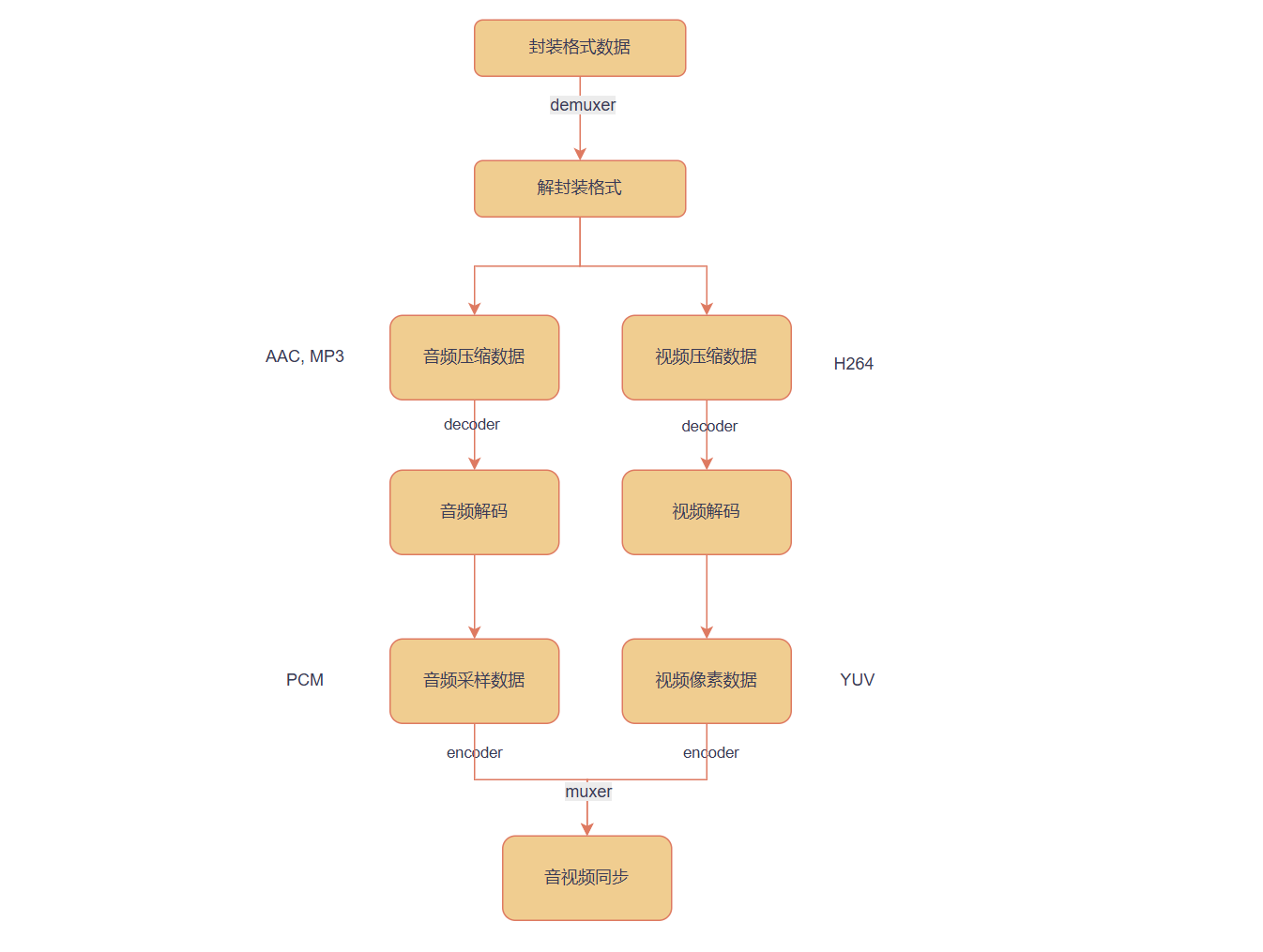 通过这个框架,就能实现 "输入文件→解封装→解码→重新编码→复用→输出文件" 的完整流程。如需播放(而非输出文件),则在解码后将原始帧(YUV/PCM)交给渲染层(如 SDL 显示视频、播放音频)即可