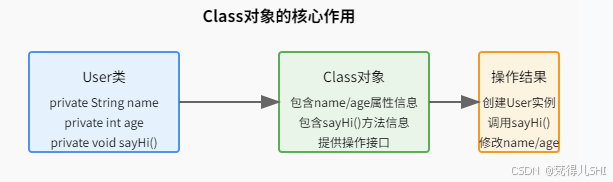 从图中可以清晰看到:Class 对象就像类的 "说明书",反射通过这份说明书,就能操作原本不可见的类成员。