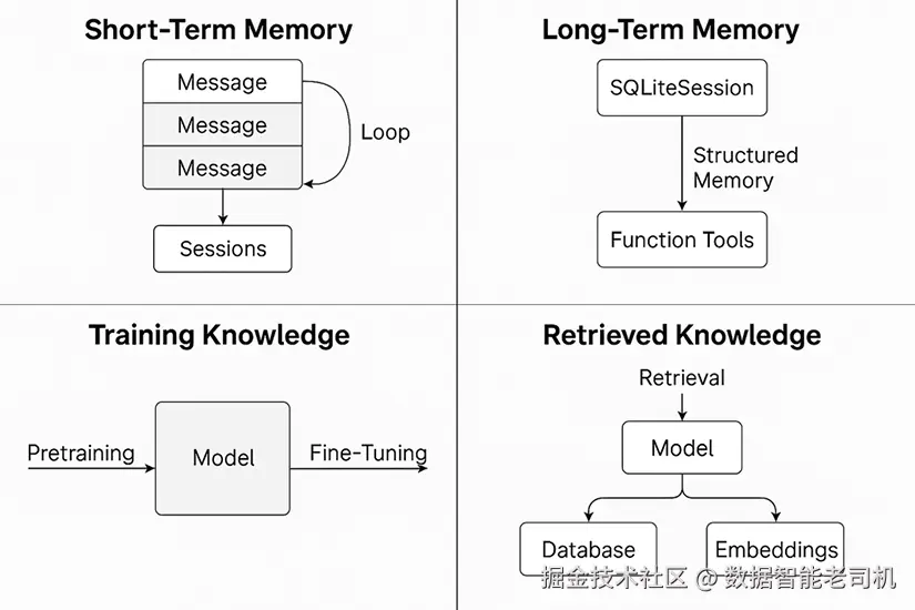 在会话之间持久化记忆 ,并通过函数工具 存储/回忆关键事实,进一步实现结构化记忆 - 训练知识 :理解模型从预训练 中已有的知识,以及微调如何改变这些知识