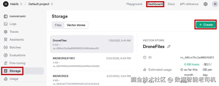 - 右上角 Dashboard → 左侧 Storage → 切换到 Vector stores。