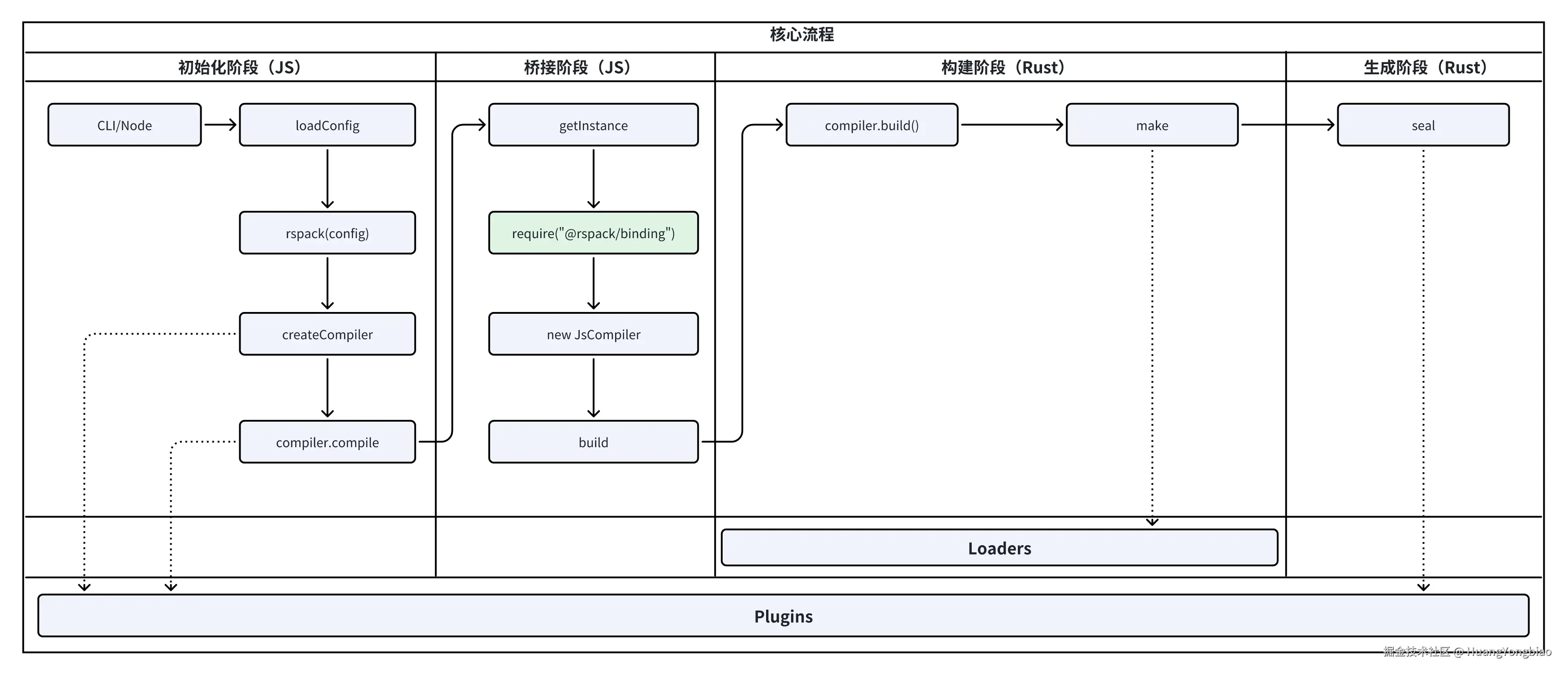 需要注意的是,在这四个阶段中,Loader 和 Plugin 机制始终贯穿始终,它们共同构成了 Rspack 框架的核心支撑体系,让整个构建过程既灵活又高效。