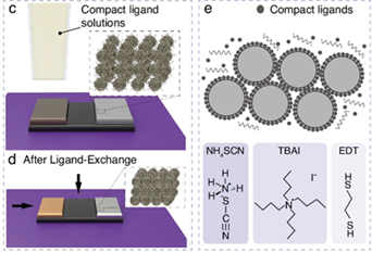 **原理与过程:**打印后,用含紧凑配体(如 NH₄SCN、EDT、TBAI 等,图 1e)的溶液浸泡 30-120 秒,替换掉长链配体;从图 1c 的示意图可看到,配体交换后纳米晶间距显著缩短,且表面化学性质从非极性转为极性,避免后续层打印时的再溶解;
