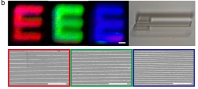 **结构与效果:**不同间距的 Ag 纳米晶光栅 ------2220 nm 间距对应红光、1720 nm 对应绿光、1320 nm 对应蓝光,光学照片与 SEM 图清晰呈现"E"形图案的均匀性;