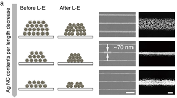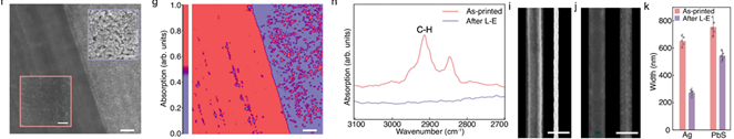 **效果验证:**纳米 - FTIR测试显示,经 NH₄SCN 处理后,打印层在 2900 cm⁻¹ 处的 C-H 键吸收峰完全消失,证明长链配体已被彻底去除;同时,SEM 观察与尺寸统计表明,Ag 纳米晶线宽从 651±49 nm 缩减至 274±31 nm,PbS 纳米晶线宽从 754±65 nm 缩减至 544±34 nm,实现结构致密化;