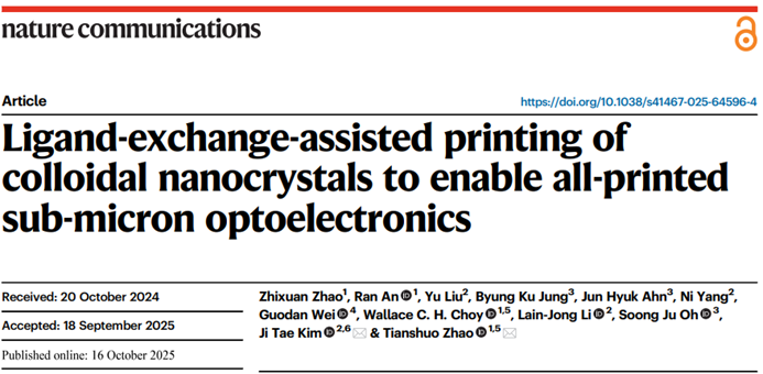 Zhao, Z., et al. Ligand-exchange-assisted printing of colloidal nanocrystals to enable all-printed sub-micron optoelectronics. Nat Commun 16, 9173 (2025).