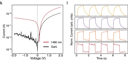 **核心性能:**I-V 曲线显示,器件在暗态下呈整流特性,暗电流仅 2.1×10⁻¹² A,1480 nm 光照下产生明显光电流,且能实现 0.2 V 的开路电压;瞬态响应曲线表明,其光响应时间小于 20 ms,远快于单层 PbS 光电导器件(~300 ms);