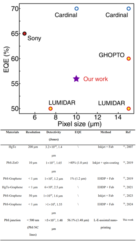 **像素突破:**通过优化打印轨迹,器件像素尺寸低至 9×9 微米,接近商用红外成像仪水平,且外量子效率(EQE)达 56.1%,无需透明电极,避免光吸收损失。