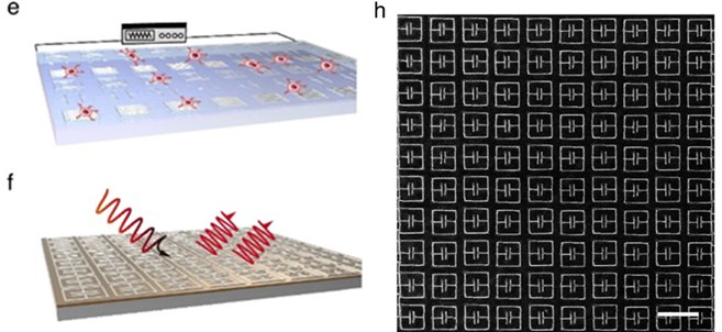 **红外超表面:**分裂环谐振器超表面的示意图,SEM 图验证了其亚波长结构精度,该结构能在长波红外波段(LWIR)产生共振,可用于红外成像、环境监测;