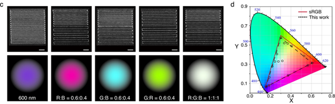 利用 Ag 纳米晶打印的光栅结构,通过控制线宽和间距(600-1900 纳米),能将白光衍射成单色光,实现红、绿、蓝(RGB)全色域显示:
