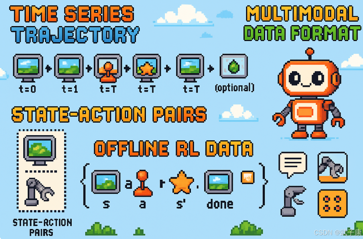时间序列轨迹是一种结构化的数据表示形式,主要用于记录智能体与环境交互过程中的状态-动作序列。在强化学习和机器人控制领域,这种数据通常以时间步为单位组织,每条完整轨迹可以表示为: