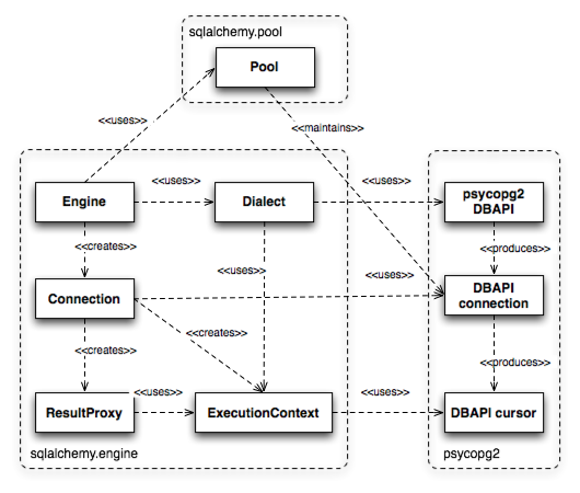 SQLAlchemy creates a facade around the classical DBAPI conversation. The point of entry to this facade is the create_engine