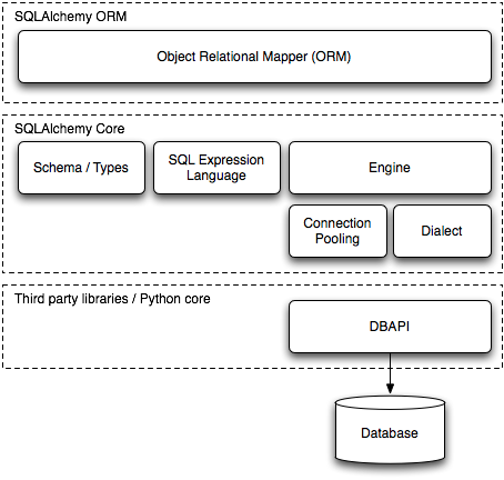 Central to SQLAlchemy's goal of providing a toolkit approach is that it exposes every layer of database interaction as a rich API, dividing the task into two main categories known as Core and ORM . The Core includes Python Database API (DBAPI) interaction, rendering of textual SQL statements understood by the database, and schema management. These features are all presented as public APIs. The ORM, or object-relational mapper, is then a specific library built on top of the Core. The ORM provided with SQLAlchemy is only one of any number of possible object abstraction layers that could be built upon the Core, and many developers and organizations build their applications on top of the Core directly.