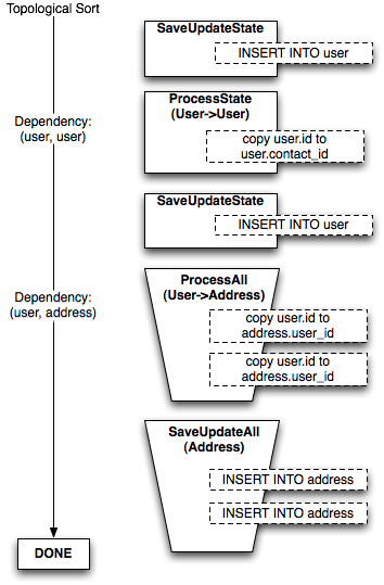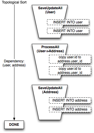 The unit of work features a system where the topological sort is performed at two different levels, based on the structure of dependencies present. The first level organizes persistence steps into buckets based on the dependencies between mappers, that is, full "buckets" of objects corresponding to a particular class. The second level breaks up zero or more of these "buckets" into smaller batches, to handle the case of reference cycles or self-referring tables. Figure 20.15 illustrates the "buckets" generated to insert a set of User
