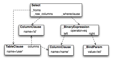 , rather than directly to their string column names as expressed in the database; to produce a SELECT query using a structure called select
