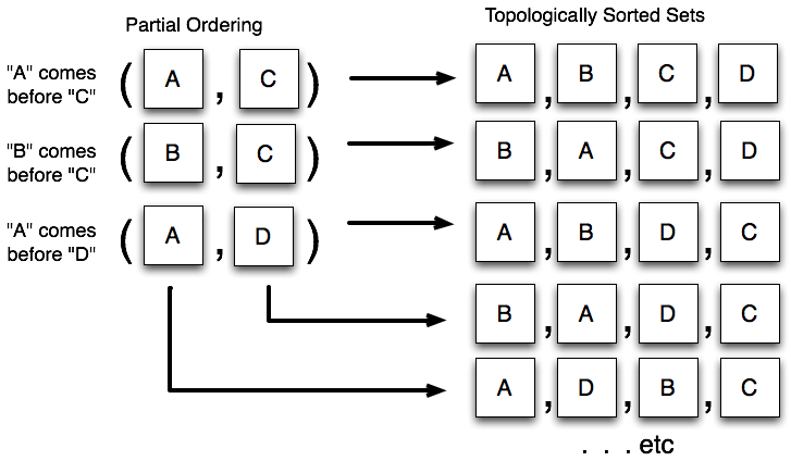 工作单元背后的关键范式是将所有要执行的操作组装成一个数据结构,其中每个节点代表一个步骤;在设计模式术语中,这被称为命令模式。在这个结构中的"命令"序列然后使用拓扑排序组织成特定的顺序。拓扑排序是一个基于偏序关系对项目进行排序的过程,也就是说,只有某些元素必须排在其他元素之前。图 20.14 说明了拓扑排序的行为。