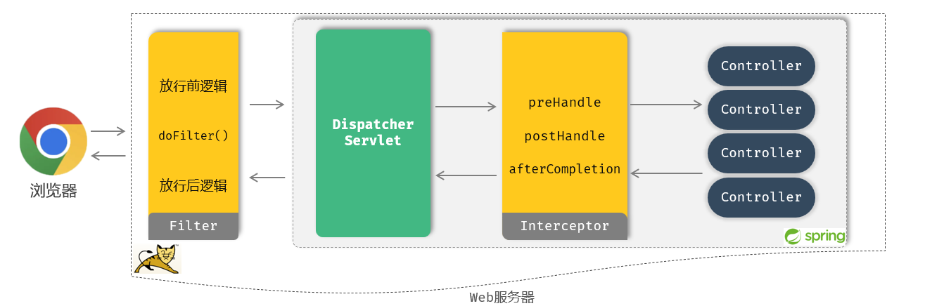①接口规范不同:过滤器需要实现Filter接口,而拦截器需要实现HandlerInterceptor接口