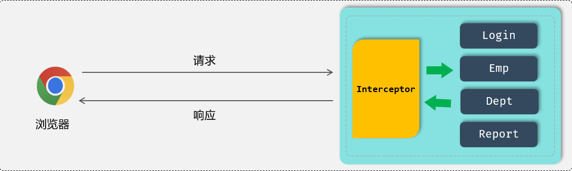 ②拦截范围不同:过滤器Filter会拦截所有资源,而Interceptor只会拦截Spring环境中的资源