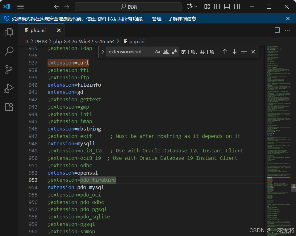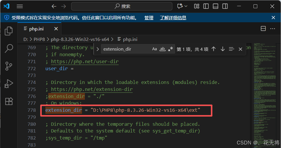 第一,通过快捷键 ctrl + F 找到 extension_dir