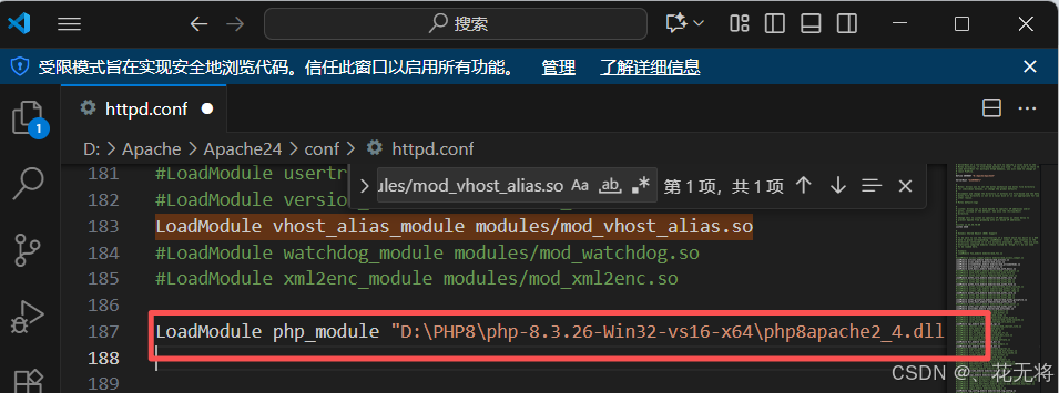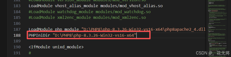 粘贴 :LoadModule php_module "D:\PHP8\php-8.3.26-Win32-vs16-x64\php8apache2_4.dll"
