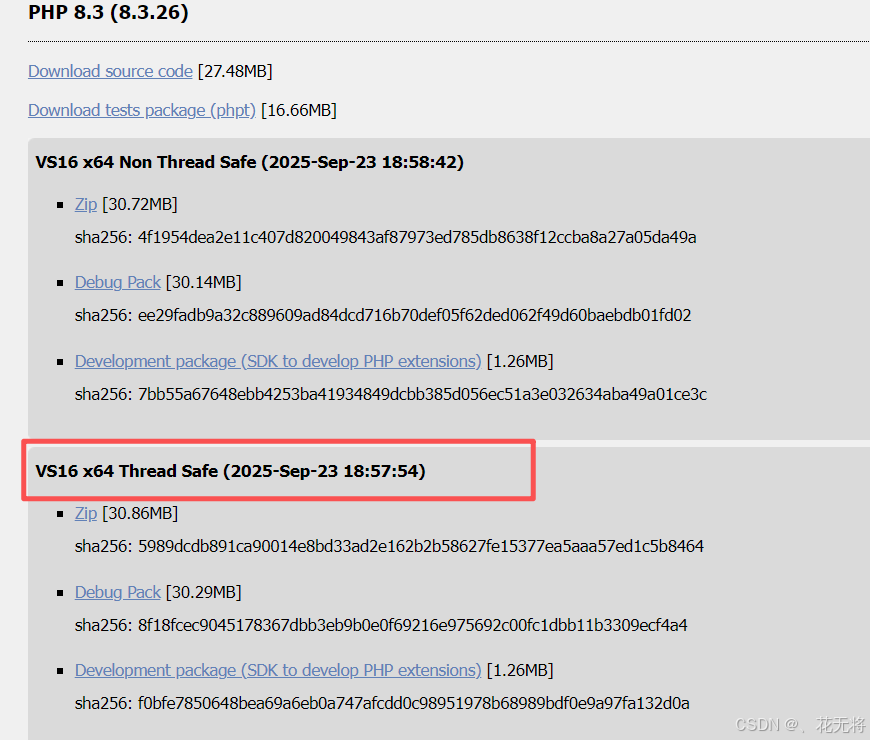 如与 apache 服务器搭建,最好下载 Thread Safe 版本,因为这个版本配备了 php8apache2_4 文件,有利于与 apache 建立联系。